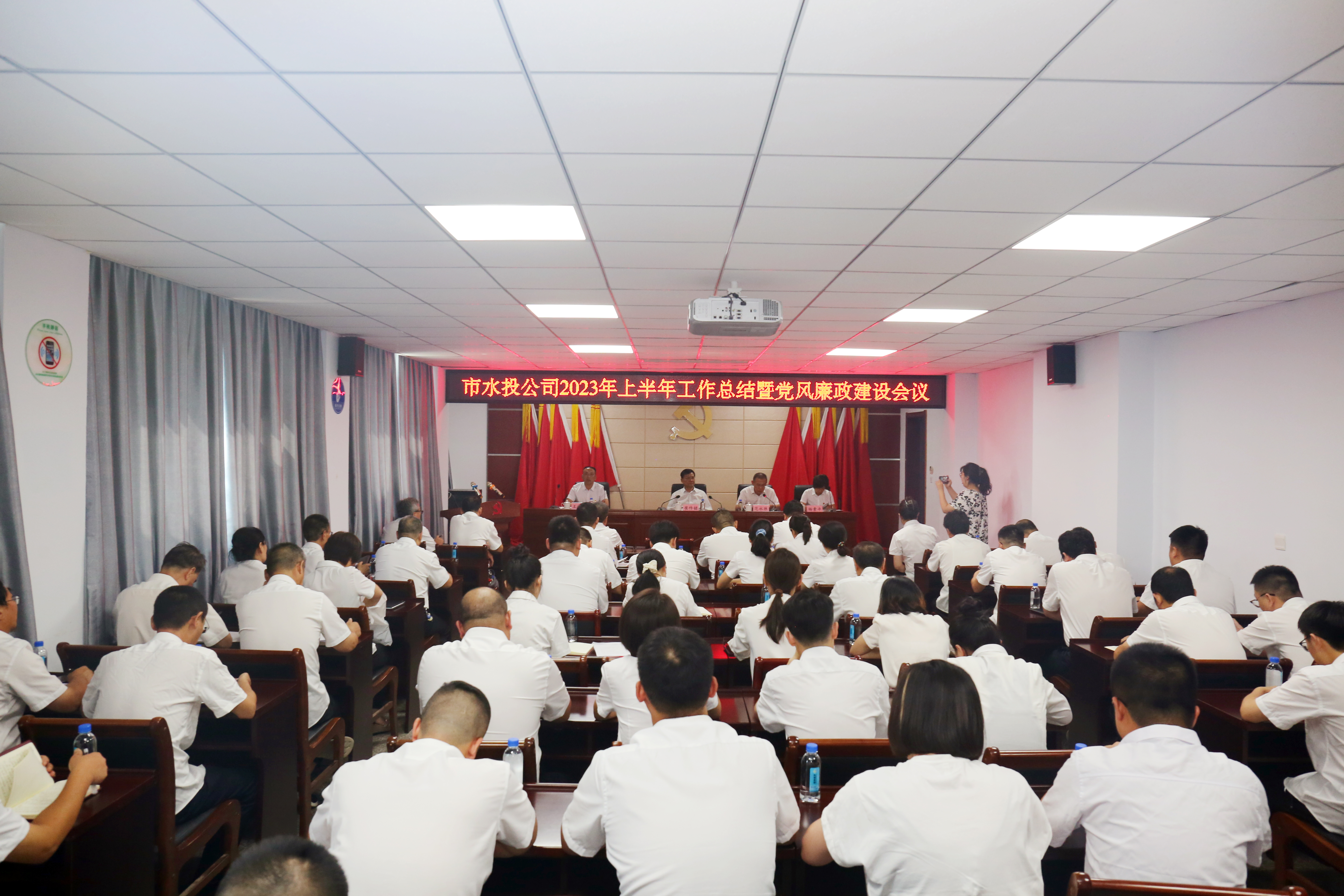 為動員公司廣大黨員干部群眾凝聚共識、知責(zé)奮進,奮力推進公司高質(zhì)量發(fā)展取得新成效,8月1日下午,市水投公司召開2023年上半年工作總結(jié)暨黨風(fēng)廉政建設(shè)工作會議,全面總結(jié)回顧上半年工作情況,深入分析當(dāng)前存在的突出問題和短板弱項,安排部署下半年黨風(fēng)廉政建設(shè)工作和重點業(yè)務(wù)工作。市水投公司黨委書記、董事長崔作銘出席會議并講話,黨委委員、副總經(jīng)理范永勝主持會議,公司領(lǐng)導(dǎo)班子成員、各子公司班子成員、機關(guān)全體員工參加會議。