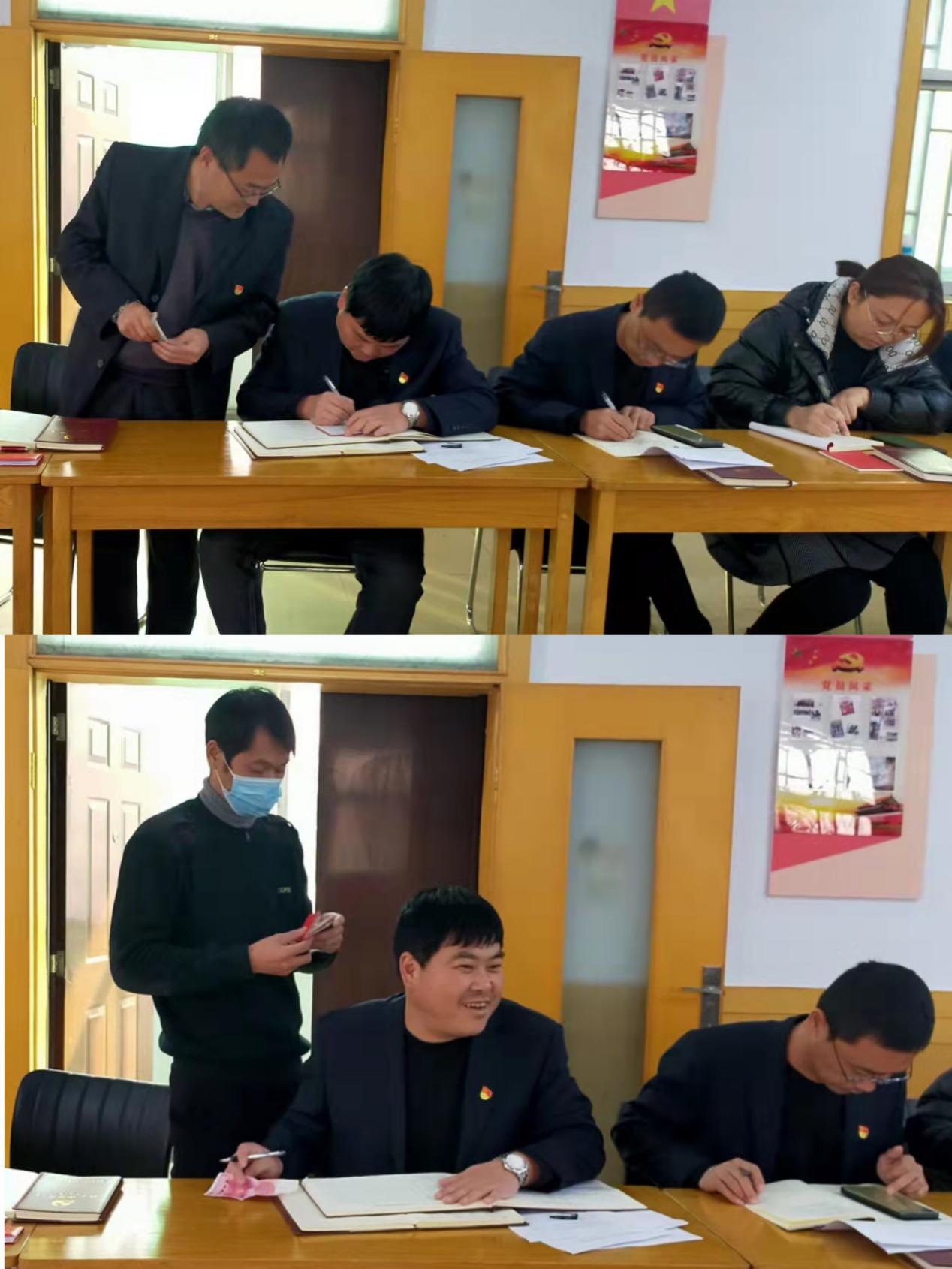 會(huì)前,全體黨員逐個(gè)向支部繳納了本月黨費(fèi),并進(jìn)行了黨費(fèi)收繳臺(tái)賬登記。