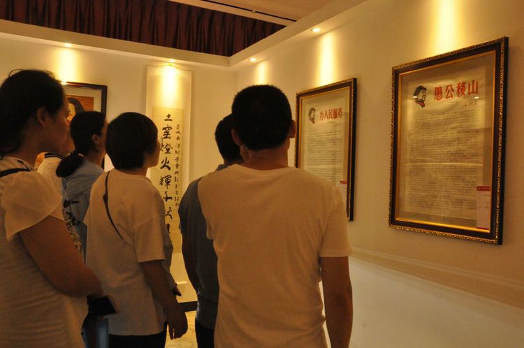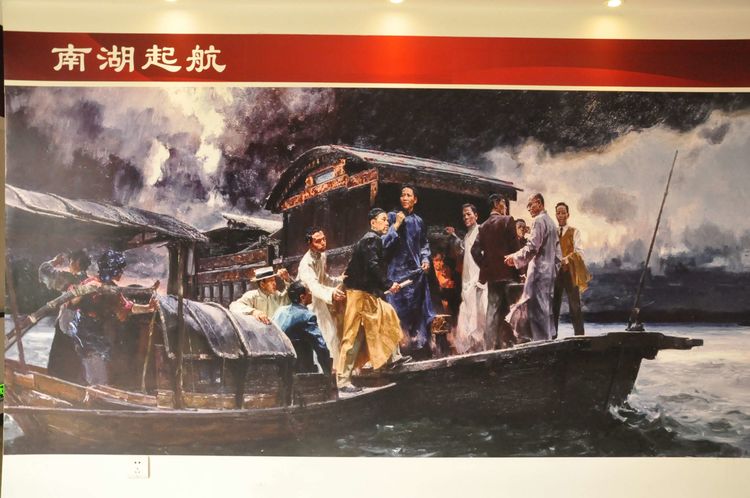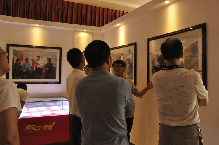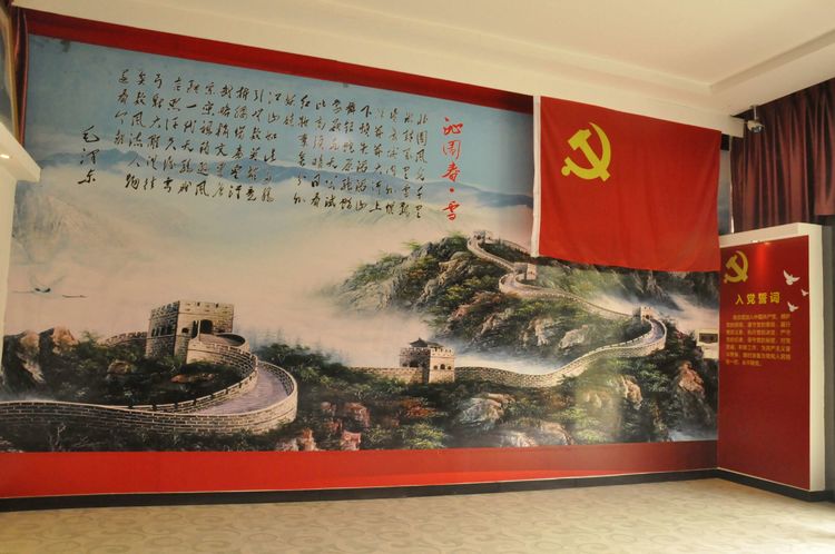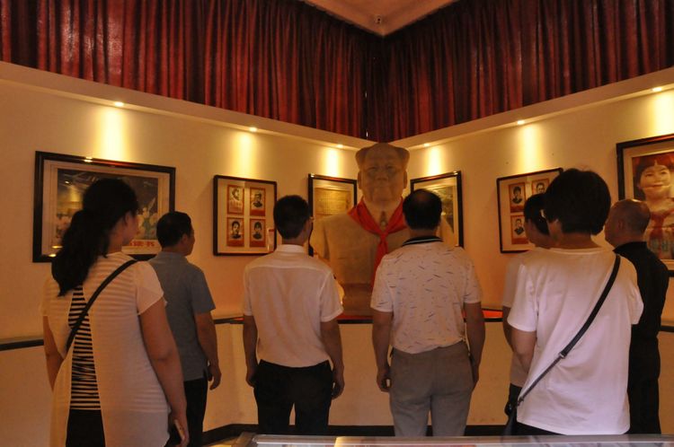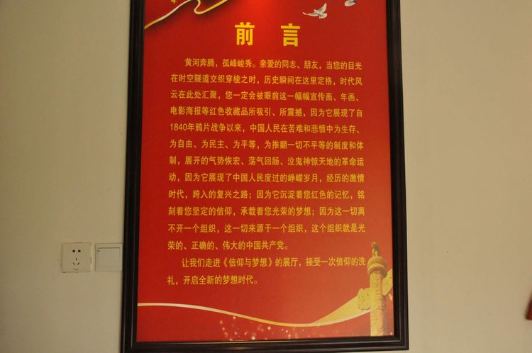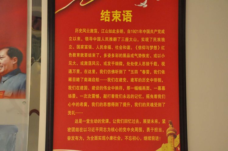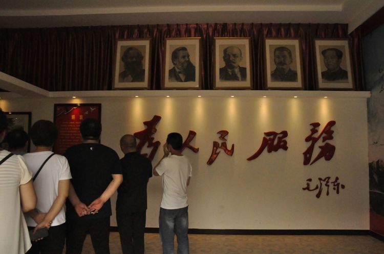 沿著山坡繼續(xù)往上,一座寬敞明亮的二層大展廳,以傳統(tǒng)的手工制作,農(nóng)耕家俱和紡織流程為主的實物展覽,以此教育宣揚,不忘初心,感恩社會,感恩父輩的孝道文化。好在天氣不十分熱,立陡的山坡,讓每個人爬得氣喘噓噓。即將爬到山頂,一座紅色教育基地,《信仰與夢想》展廳,進入了人們的視線。踏入展廳大門,正面牆上懸掛著由左向右排列的,馬克思,恩格斯,列寧,斯大林,毛澤東五位導(dǎo)師和領(lǐng)袖畫像,下面是毛主席的《為人民服務(wù)》五個大字。右面山牆上是巨幅萬里長城國畫和鮮艷的中國共產(chǎn)黨黨旗和入黨誓詞。左面牆上是一幅《南湖起航》油畫。